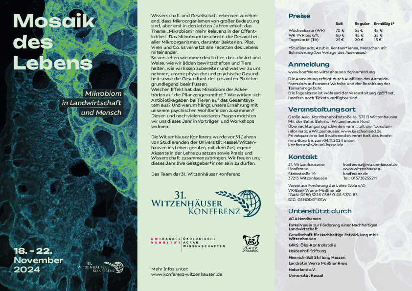 Im Anhang findet ihr unseren Flyer mit dem Programm und weiteren Informationen. Die Anmeldung wird bald geöffnet und die Tickets sind begrenzt! Melde dich deswegen am besten zeitnah an, um eine Woche voll mit spannenden Einblicken in die Forschung rund ums Mikrobiom zu gelangen. Anmelden kannst du dich jetzt bald auf unserer Internetseite: www.konferenz-witzenhausen.de